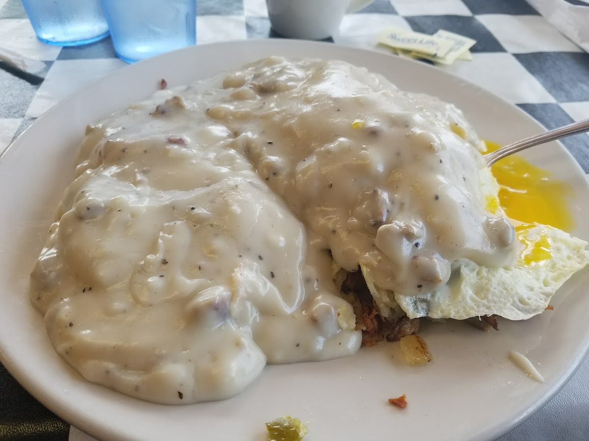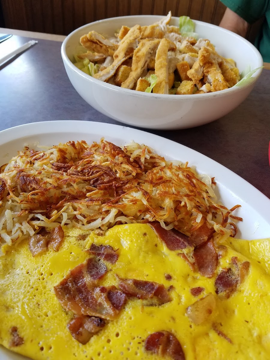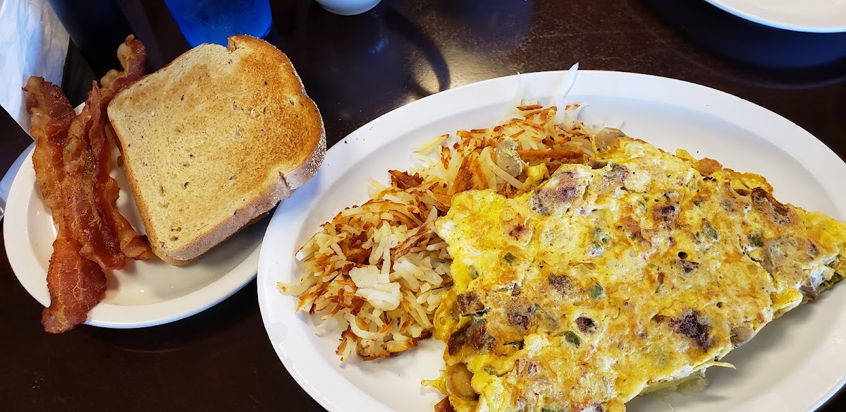 Everything the wonderful people the great kitchen I sat at the countertop so I got to watch the action the bar top of the food. Everything was perfect. Just the eggs just the way all of us liked it in our group omelette was stuffed full hashbrowns with crispy brown the pancake was wonderful like a cake everything you just can’t give a five stars to a place like this if you’re anywhere in the area it’s a good eat for breakfast.